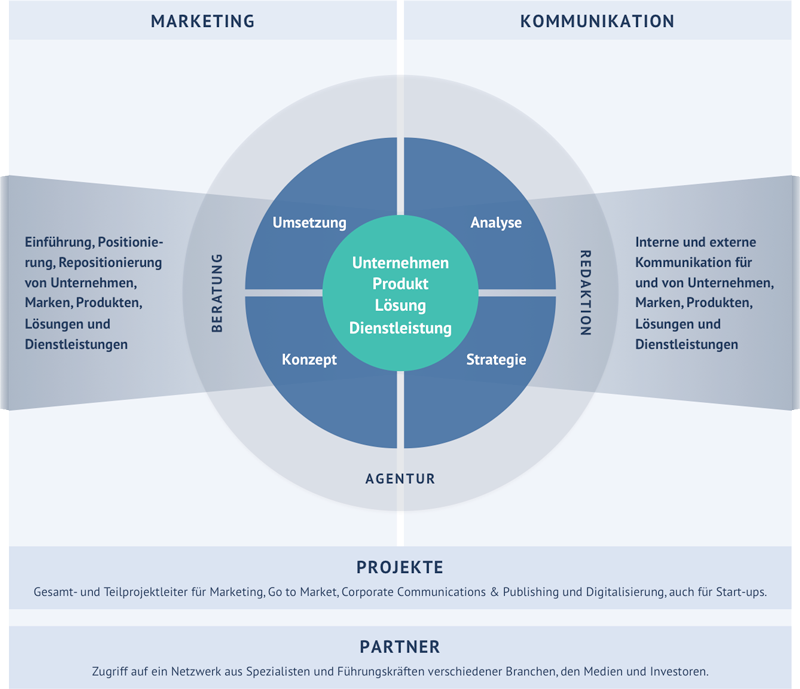 Wir entwickeln individuell auf unsere Kunden zugeschnittene Konzepte, Kommunikations- und Marketingpläne. Unserer Berater und Projektleiter unterstützen Sie bei der operativen Umsetzung von Markt- und Wettbewerbs-Strategien, Ihrer Medienarbeit und Public Relations, Ihrer Marken-Positionierung und Werbung.